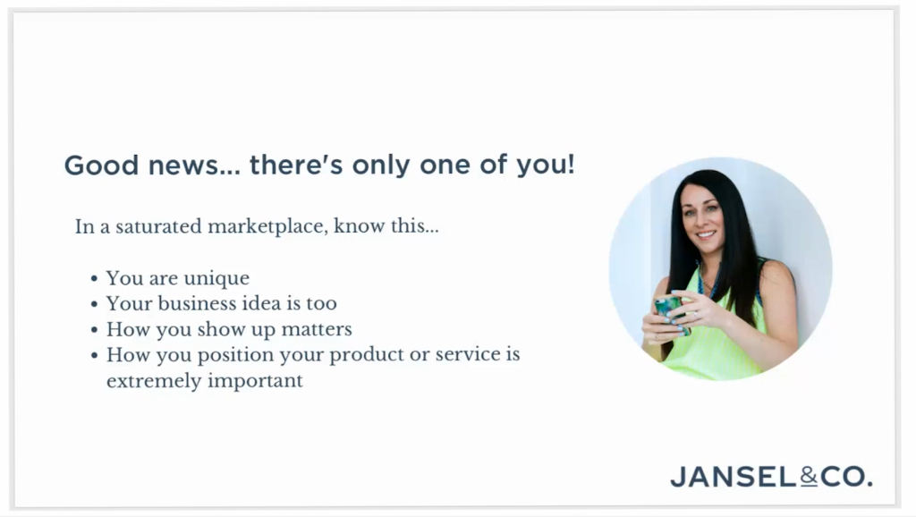 While the market may be saturated with similar ideas, one thing remains the same: there is only one of you! What makes you and your business unique, how you show up, and knowing how to position your products and services on the market (your website, marketing, and social media) is the key to your success. Having worked with many different startup companies and entrepreneurs, it’s become clear to Sarah that what works, what doesn’t, and what makes a lasting business.