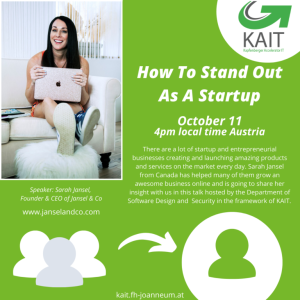 There are a lot of startup and entrepreneurial businesses creating and launching amazing products and services on the market every day. Sarah Jansel from Canada has helped many of them grow an awesome business online and she shared her insight with us in her talk hosted by the Department of Software Design & Security in the framework of KAIT.